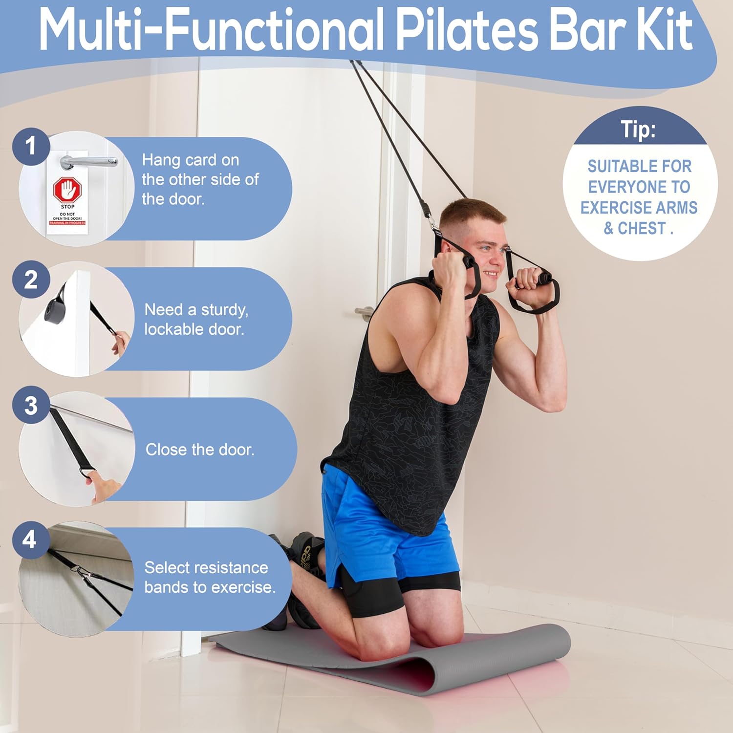• YOUR PORTABLE GYM IN A BAG: Our at home workout equipment kit includes 1x 3-section high-quality steel bar, 6x resistance bands, 2x foot-hand loops, 1x door anchor, 2x ankle straps, 1x large exercise instruction poster, 1x workout door sign, and 1x large carry bag for easy portability.