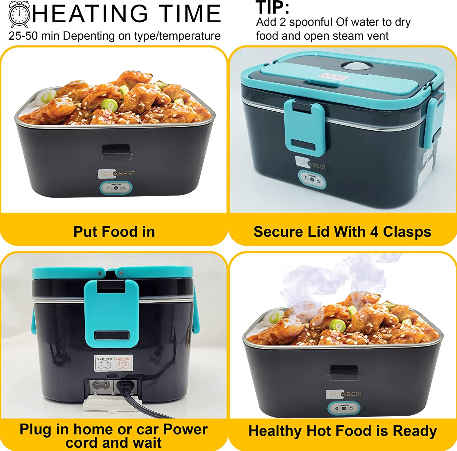 - Great Hot Food without Leaks- FORABEST Large capacity design holds juicy soups and stews to satisfy your appetite so you can enjoy a hearty meal without the mess during transit. It has fast and efficient 60W heating element. It’s completely leakproof. All 4 latches must click firmly in place. Add to CART NOW!